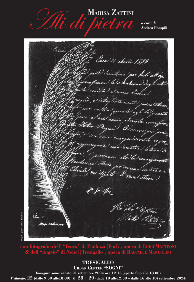 The exhibition “Ali di pietra” (Wings of stone) by artist Marisa Zattini is part of the program of the “Metaphysical Days” organized in the town of Tresigallo, Italy. It is on an eagle’s feather that the artist proposes in the calligram, which is grafted onto an ancient 19th-century letter, chosen as the image for the exhibition. A tale that becomes word and then sign, as in the calligram that opens the exhibition, in a reciprocal motion for this ‘mirror double’ of refined execution.